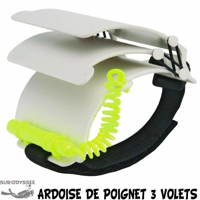 Ardoise de poignet 3 volets, très pratique grâce Ă sa forme arrondie tenant parfaitement sur l’avant-bras. Elle reste toujours disponible sans gĂŞner les mouvements.