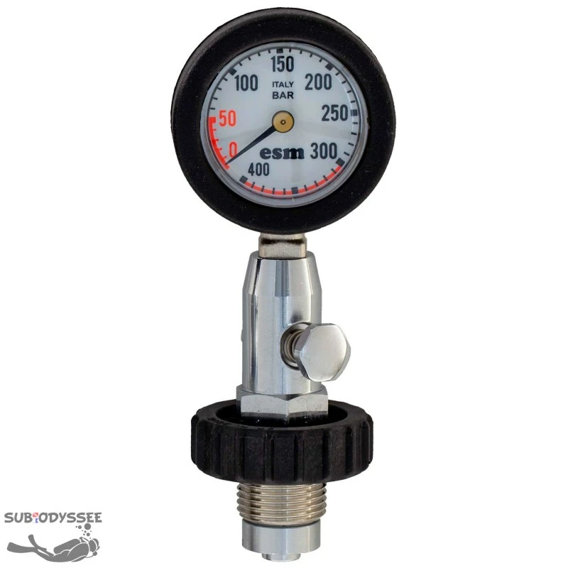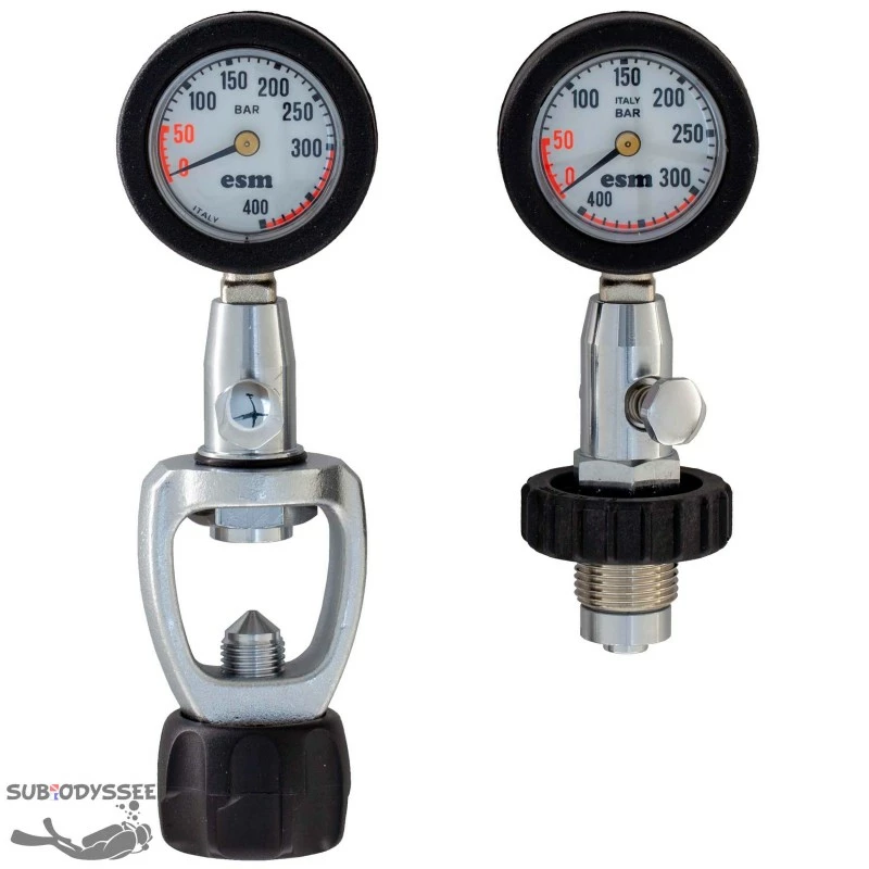 ManomĂštre de surface pour le contrĂŽle de pression des bouteilles de plongĂ©e. Existe en deux versions l’un en DIN l’autre en INT (Ă©trier).